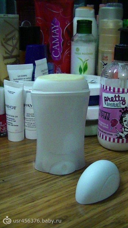 Единственный минус — залитый в баночку, а затем застывший «дезодорант» очень неудобно наносить! Масло какао само по себе твердое, а тут еще такая доля сухих веществ, кремом данный состав быть ну никак не может.Я «залила» его в стик из под магазинного дезодоранта.И вот, что у меня получилось: