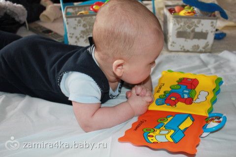 И очень любит книжки сам читать, в смысле он он их грызет, мягкие для ванны
