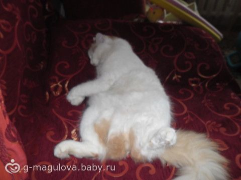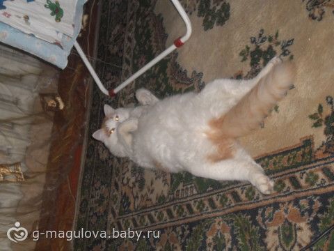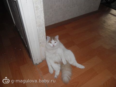 Кстати, он других животных кроме голубей у окна и себя в зеркале никого не видел))) Кажется он думет что он человек. Спит рядом с нами, положив голову на подушку. И лежит животом вверх, а не клубочком как все коты. Сидит тоже как чел, важный такой… Попой сидит и облизывается. А иногда сидя на попе кушает лапкой… Это вообще умора
