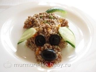 Готовое мясо пропускаем через мясорубку и укладываем ровным слоем в небольшой, глиняный горшочек. Далее идёт слой мелко порезанной моркови. Следующий слой – зелёный горошек. Сверху засыпаем промытой гречкой и заливаем бульоном. Горшочек закрываем крышкой и ставим в духовку, готовим при температуре 180 градусов примерно час, это зависит от духовки. Когда вода выпарилась, выключаем духовку и даём немного постоять, а потом перемешиваем компоненты. Гречневая каша с мясом и овощами готова! Дорогие мамочки, если хотите порадовать своего малыша, оформите блюдо в виде маленькой собачки. При помощи ложки сформируйте тело, из огурца вырежьте ушки и хвостик, а из оливки носик и глазки.