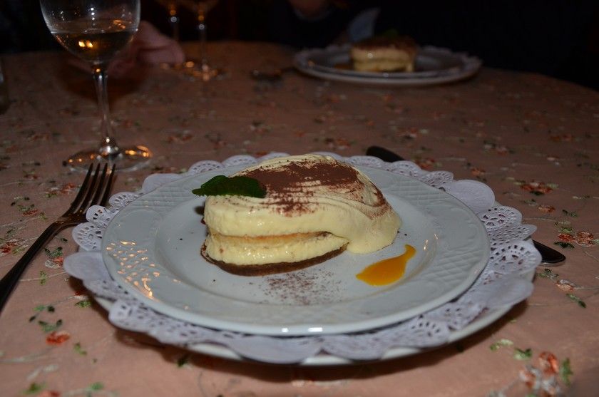 Их фирменное блюдо-ризотто с белыми грибами в сыре пармезан. В сыре весом 100 кг вырезана дыра. туда кладётся ризото, размешивается и выкладывается на тарелку. Очень вкусно.