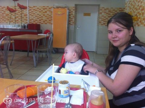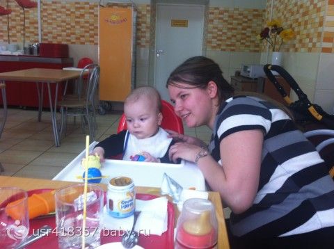 Сходили все вместе в кафе недалеко от дома.Макс сначала спал в коляске, потом проснулся, немного прибалдел от того, что оказался в непонятном месте)))Я его покормила — от шока съел 50 гр творога и 100 гр пюре фруктового)))