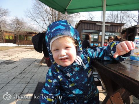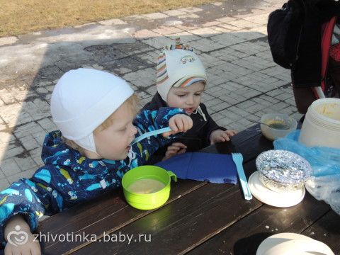 Уже в парке. Теперь едим на солнышке, Кэть так и заявила, не хочу в домик (харчевенку), а хочу есть на улице. На Катерине новая шапочка. Колина (огого! завидуйте!))):