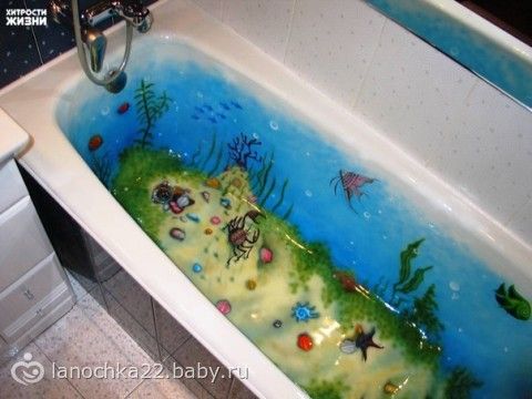 прикольно как, жаль у нас кабинка, а в ванну сделала бы так с удовольствием!!! если это акриловый вкладыш, то долго прослужит.