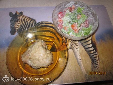 уходя утром гулять, оставила кусок курицы в соевом соусе, когда выпекать клала, обваляла в кунжуте, вкуснооооо.Кожу сняла перед маринованием.Салат из свежих овощей, заправленный йогуртом.