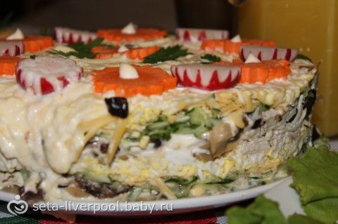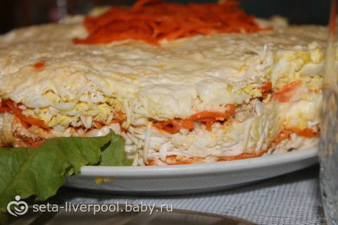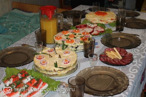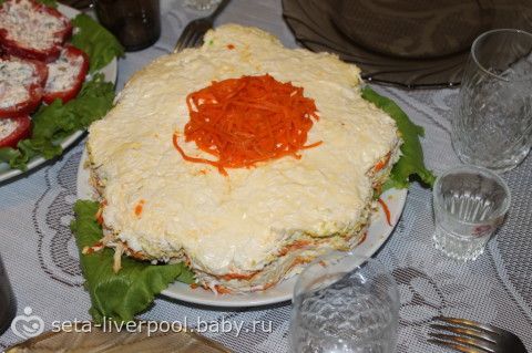 ну так вот. салатов было три. «Рыбка в пруду», «Березка» и салат с корейской морковкой. рецепты первых есть в интернете, а последний: слоями курочка, корейская морковка(я через два слоя классической активией промазываю), сыр, яйцо. и увот именно он мне понравился… А, кстати,«Березка» только на след.день стала вкусной. но я не сторонник того, что бы салаты столько настаивались. Рыбка в пруду не понравилась вообше.наверное потому что я не люблю шпроты.
