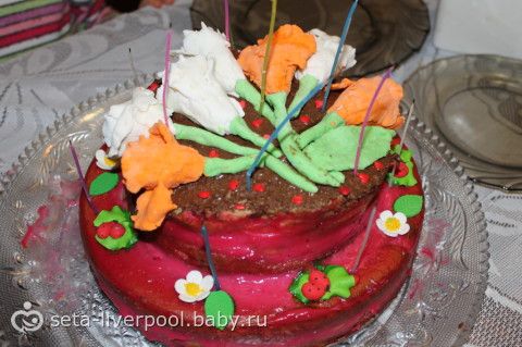 торт – это ужас. цветы с мастики не получились. а крем которым обмазывала все решила крестная сделать. вот такой дикий розовый цвет… зато ооочень вкусный. аж мне понравился, хоть смотрится и не аппетитно.