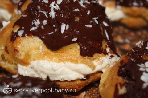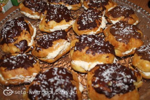 на а эклерчики сделала сегодня. рецепт заварного теста тоже можно найти в интеренете, а крем: творог 400 гр, банга сгущенки и пачка ванилина.