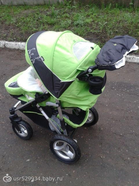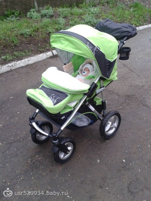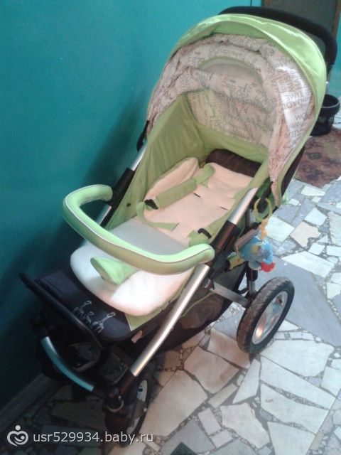 Ну а теперь ближе к делу. Выбирала я очень тщательно. главным критерием были большие, надувные колеса, амортизация, большой кап, лежачее положение спинки. Так же есть дождевик классный, противомоскитка пристегивается к капу на молнии + отделка у нее ажурная, кружевная немного(тоже приятно). Материал коляски достаточно качественный, сшита тоже не придерешься)) Остальные штучки-приятное дополнение(муфта, насос, подстаканник).