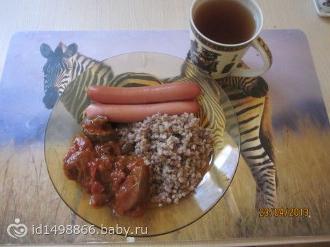 2 сосиски с гречкой и баклажаны с перцем (готовые из банки).Фруктовый чай.