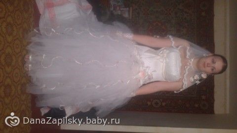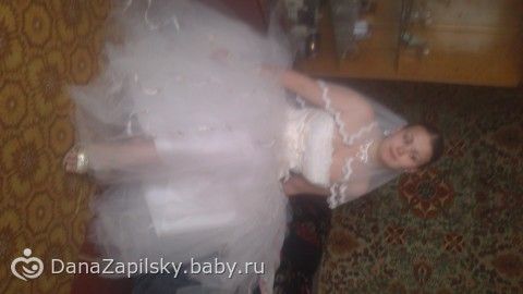 Описываю то, что не особо заметно — цвет — светлый, шампань. Лилии на юбке с розовыми серединками, от них по всей юбке бело-золотые «веточки». Верх корсажа расшит бисером (до банта). Юбка выглядит расправленно-воздушной. Перчатки расшиты бисером, фата по канту — тоже. Цветы в волосах — роза с маленькими лилиями в цвет тех, что на платье (розу не видно).