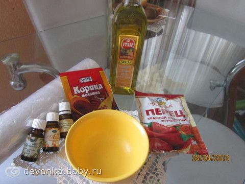 Корица+красный перец+оливковое масло+эфирные масла цитрусовых (по желанию). На сегодня у меня этих процедур сделано уже 5. делаю через день. Результатом довольна, прям чувствую его, этот результат!