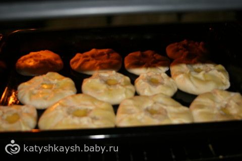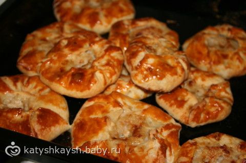 Поделила на кружочки, раскатала, начинила, смазала желтком, и поставила в духовку, как в рецепте