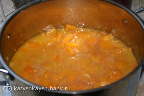 Перекладываем в кастрюлю, наливаем воду из чайника, что бы уровень воды была на 2 пальца выше тыквы)))