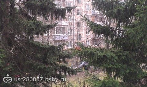 У нас перед подъездом растут 2 елки, на одной из них живет белочка
