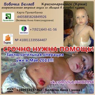 Грядет завершающая операция: Вовочке закроют стому (есть возможность(риск) того что анус переделают). В начале мая едем на плановый осмотр, следом в Санкт-Петербург на консультацию (возможно дополнительное обследование стоимость которого неизвестна) наш лечащий хирург не исключает того что в Санкт- Петербурге мы будем лежать на стационаре. После консультации я буду настаивать на проведении операции без промедления.