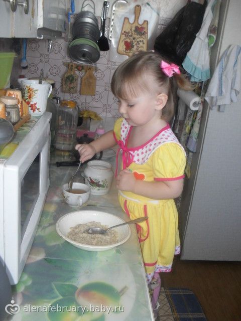 у нас пока возраст такой.- все сама, сама, сама… даже кашу сама готова варить, вот поэтому стараюсь встать пораньше дочи минут на 15… эх и тяжело мне это дается..
