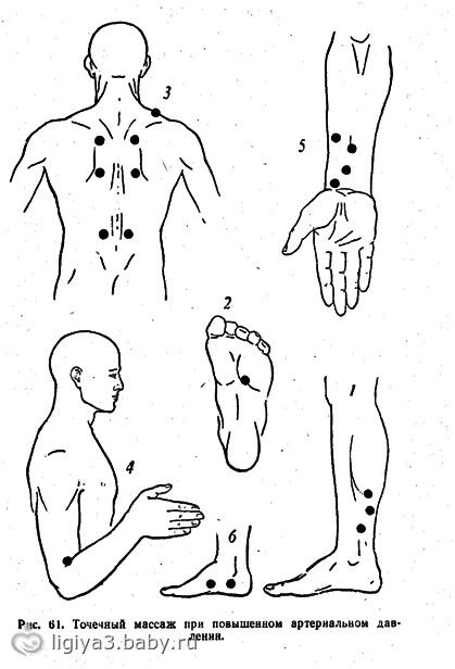 Точечный массаж при повышенном давлении.При повышенном артериальном давлениинеобходим массаж определенных точек. Во всех случаях каждую точку массируюттак: давят большим или указательным пальцем, совершая ритмичные круговыевращения по часовой стрелке; одну минуту давление на точку слабое, вторуюминуту давят сильно и третью минуту – опять слабо.