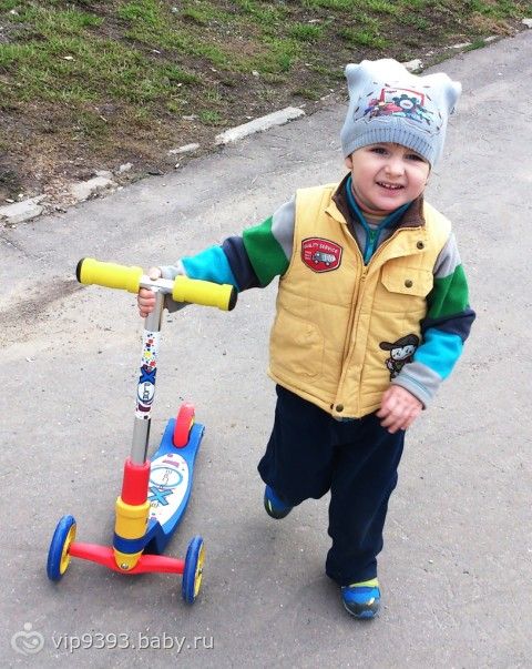 Мой не хочет даже садиться на них. Дома стоит машинка-каталка, купили в год, лошадка-качалка, на которую он не сел ни разу, олень-прыгун, на котором он сидел пару раз, велосипед, который ему скоро будет мал, но садиться на него он не хочет категорически. Из последнего приобретения самокат, с которым мы теперь ходим гулять на улицу, но он на него не встает и не хочет толкаться. Катание самоката выглядит вот так.