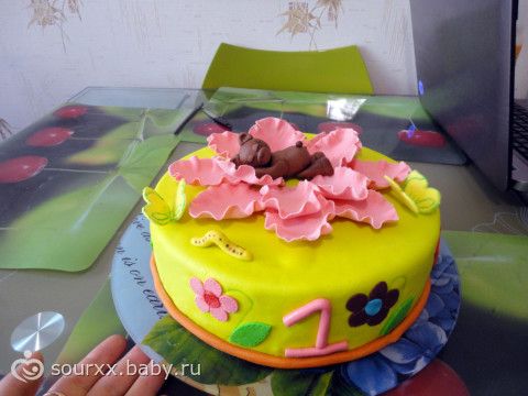 очень красивый и аппетитный тортик))))мммм...)))единственное я бы наверно единичку чуть поменьше в ширину сделала, а так супер!!! тожеивсе хочу с мастикой что нибудь попробовать сделать. как муж мультю подарил у меня такие тртики классные получаются, а в духовке вечно с бисквитом беда была))))
