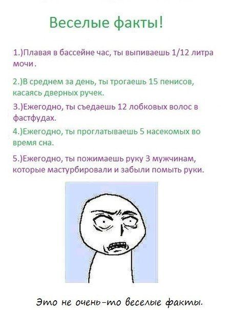 Нервным и брезгующим людям мимо!!!!!!!!!!!!!!))) 3 мая 2013 09:05 Комментарии Пожалуйста, будьте вежливы и доброжелательны к другим мамам и соблюдайте правила сообщества ПожаловатьсяСкопировать ссылку Lisenok Milana12 лет Ташкент Blin kakoy koshmar, ya tol'ko pro lobkovie volosi ne ponyala, kak oni tam okazivayutsya? ПожаловатьсяСкопировать ссылку КтоТама Роберт17 летРафаэль10 лет Самара я ж теперь с ума сойду))) ПожаловатьсяСкопировать ссылку Светик-семицветик Дениска11 лет Киев а чё лобковые волосы в фаст-фудах? ПожаловатьсяСкопировать ссылку Манюня Волгодонск Получается я только трогаю пенисы и ем букашек? ПожаловатьсяСкопировать ссылку Parfengalina Малявка14 летМарина36 лет Волгоград ко мне только второй пункт... ПожаловатьсяСкопировать ссылку Елена Анисья23 годаКирилл20 летЛюдмила15 летВалентина13 летУльяна7 лет Красноярск Выдумоно больным разумом.А насчет первого вообще бред, сейчас если в воду поподает моча, то вода окрашивается в другой цвет и воду меняют ПожаловатьсяСкопировать ссылку ЗлаяБабка Бублигумчик11 летМелкий8 лет Москва Бууууэээээээ))))) ПожаловатьсяСкопировать ссылку Сн Оксана15 летАлексей12 лет Серов ох блин,15 пенисов.... ПожаловатьсяСкопировать ссылку Катеринка Перова Анастасия16 летЯрослав12 лет Озеры ПожаловатьсяСкопировать ссылку наталья Екатерина28 летВиктория12 летЮрий9 лет Пермь ПожаловатьсяСкопировать ссылку Euphoria ПожаловатьсяСкопировать ссылку СлаДкаЯ ВиШеНкА Екатерина17 летЕлизавета15 лет Красноярск ПожаловатьсяСкопировать ссылку Иринуча Артём13 летАрсений5 лет Воронеж фууууу ПожаловатьсяСкопировать ссылку Тритатушки Тритата Татуша14 летКукуся12 летРада9 летВиктория9 лет Челябинск о них думать не надо ПожаловатьсяСкопировать ссылку Кристина Полина13 летМария10 лет Кемерово Показать ещё