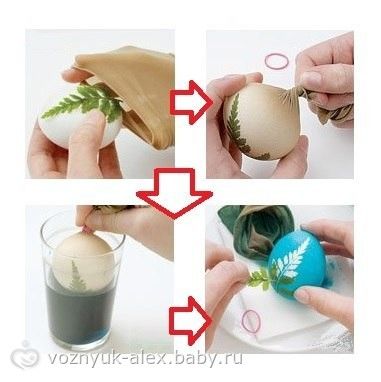 Возьмите листочек от комнатного или дикого растения, наложите его на яйцо, сверху наденьте капроновый чулок или марлю. Скрепите концы ткани резинкой. Покрасьте яйцо согласно инструкции на упаковке.