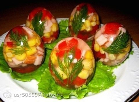 3. Уложить все слоями. Залить бульоном. Убрать в холод.С застывших яиц очистить скорлупу как с вареных. Украсить, подать в качестве холодной закуски.