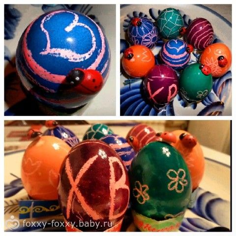 А вечером, когда муж уехал на работу, я впервые сама красила яйца на Пасху))) Заморочилась: рисовала на яйцах восковым мелком)) Вроде получилось неплохо)