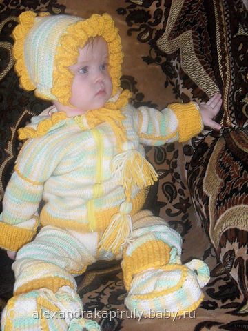 Как вам? А еще она очень много различных платьев и шапочек связала внукам своих друзей, говорю ей продавай, она мол, никто не будет покупать… вяжет все бесплатно, только нитки покупают… А как вы считаете купил ли кто-нибудь такое? Мне очень нравится! А вот эти 2-а костюмчика она нам раньше вязала: