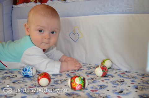 Вчера нам исполнилось 8 месяцев. Весим в 8 месяцев — 9 700, а рост 76 см. У нас уже 4 зуба и с дня на день будет пятый. Научились хлопать ладушки. Ползать отказываемся, чем расстраиваем родителей( только на четвереньки становится, раскачивается и все(. Любим смотреть мультики-песенки про черепаху-аху и мавпу)