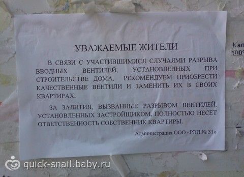 Ну и смотрите на ответ… Сами вряд ли они согласятся менять (прикладываете к жалобе копии всего что есть: чек от смены вентеля, чек на сам вентел (кстати, они его бесплатно менять должны), в жалобе обзываете это дело Приложение 1, приложение 2. Там же обязательно приписывается на самом листе жалобы что есть что, внизу. Потом собираете второй пакет документов, после их ответа, подаёте в жил.инспекцию, вместе со своей жалобой и ответом ТСЖ. ФОтографируете это объявление и прикладываете в том числе. Это они сами же на себя улику привесили)))))))) что реально разрывы идут)))
