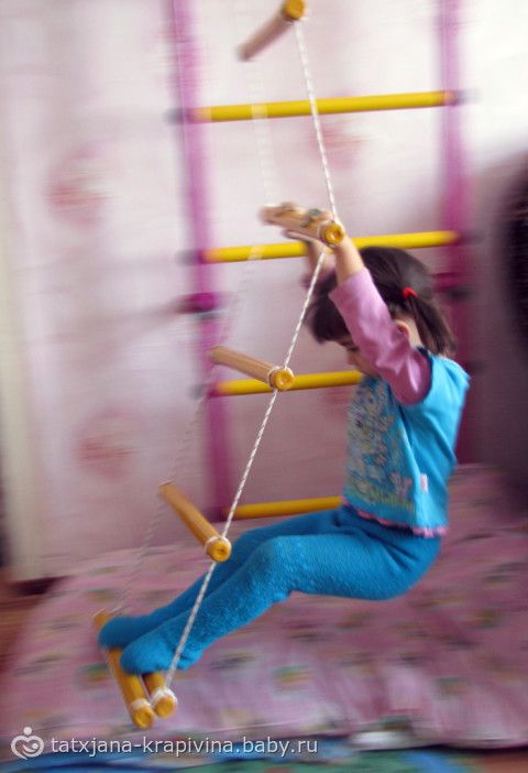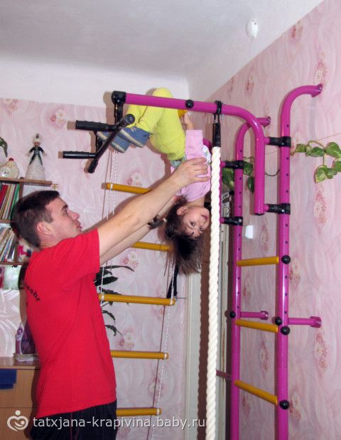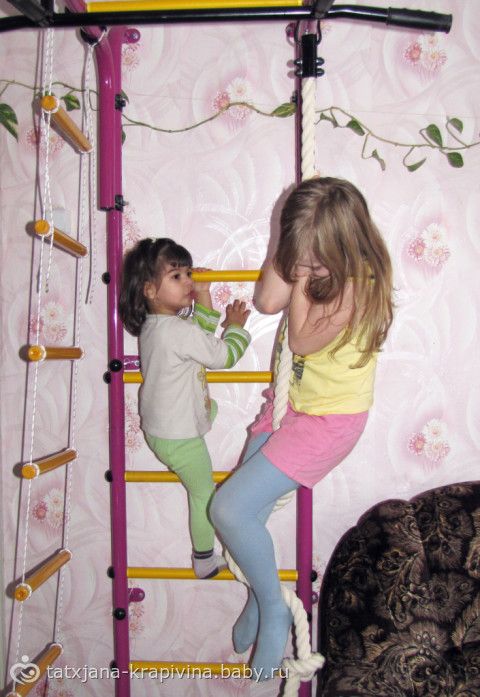спортивный уголок — это классно! у нас вообще другой, так как у нас однокомнатная квартира, и места мало. Купили такой, который крепится к стенке. Кольца пока не стали вешать, а остальное все прикрепили. Доче очень нравится, правда, приходится все время страховать. Купили когда ей было 2 с половиной (примерно) года. Верхние ступеньки убрали пока, чтобы сильно высоко не залазила