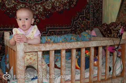 Приехали мы в деревню. Вынесли свекр со свекровью эту кроватку… с первого взгляда мне показалось что она курицами засижена ))))) Но потом выяснилось, что это местная чета художников брали ее для внука на время пару лет назад, и покрасили ее так. А потом еще выяснилась, что кроватку эту делал какой то местный умелец еще для дяди мужа моего. Аж в 1958 году! В ней вырос сначала дядя, потом свекр, потом сестра мужа и сам муж мой. Еще так брали эту кроватку многие, к кому дети с малышами приезжали )))) И ничего ей не делается. (А у наших современных и от одного ребенка болты отваливаются). Правда углы немного топорные и острые… но я на них шапки натягивала, чтоб доча не ударилась.