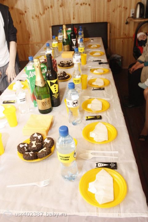Т.к крестили нашего джентельмена, то и цвета выбирали соответсвующие- желтый, белый и черный и главный атрибут был- бабочка. Вот такая получилась сервировка, скатерть и тарелки в тон, салфетки сложенны в рубашечку, да печеньки тоже при параде))