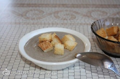 К супчику можно подсушить гренки. В этот раз я просто нарезала батон на кубики и подсушила в духовке. А можно взять бородинский хлеб, порезать его на тоненькие кусочки, обжарить на слив. масле и горячими натереть слегка смесью майонеза с чесноком. Получаются очень вкусные хрустящие хлебцы, которые иедально подойдут к грибному супу-пюре.