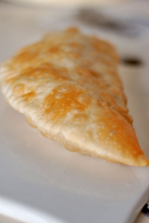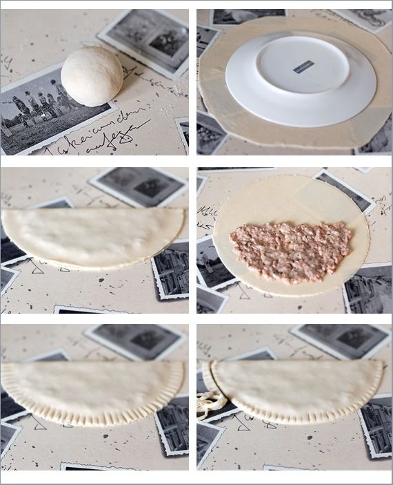 На пласт тонко раскатанного теста кладу тарелку, ножом обрезаю лишнее тесто, тоооооненьким слоем выкладываю фарш на половину круга, оставляя края. Накрываю второй половиной, вилкой защипываю края, не дотрагиваясь до фарша и не прорезая тесто, затем краем тарелки обрезаю по периметру и сразу же жарю.