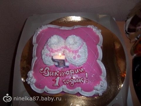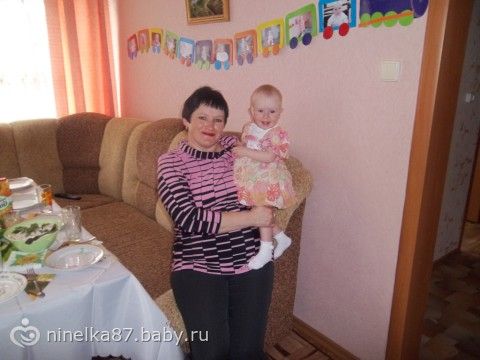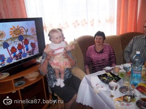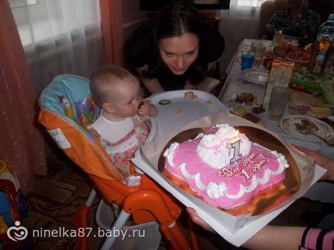 в субботу отмечали годовасие, я очень переживала, потому что дочка не переносит чужих людей в доме, орет сразу, не слазиет с моих рук, но на удивление всем она вела себя очень хорошо, даже не пикнула, сидела со всеми за столом, улыбалась, таскала со стола фрукты, хлеб, конфеты, кокетничала со всеми, улыбалась! посидели очень хорошо, как я и ожидала, подарили нам деньгами, так как я просила игрухи не дарить, потому что она в них не играет… дед подарил золотые серьги(но я их одену ей не раньше чем через лет 10!), прабабушка подарила как всегда кучу одежды, которую нам за всю жизнь не сносить! всем очень понравился торт-такого вкусного я не ела никогда, я в этот день решила забыть про диету и наслаждалась едой!