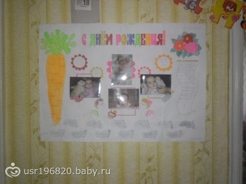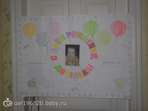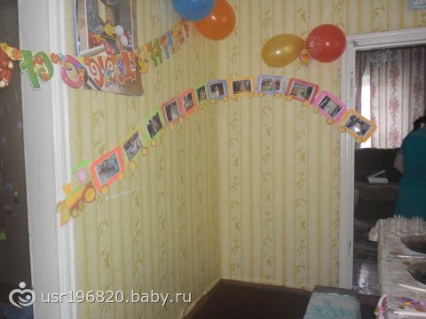 14 мая нашей младшенькой доченьке, нашей нежной и ласковой Василисушке исполнился 1 годик.Т.К.был вторник празднование перенесли на субботу.Гости были приглашены к 2 часам, Василиса к этому времени поспала, а я с братом нарядили комнату: развесили воздушные шары, плакаты, паровозик с фото про первый год.