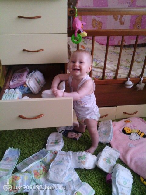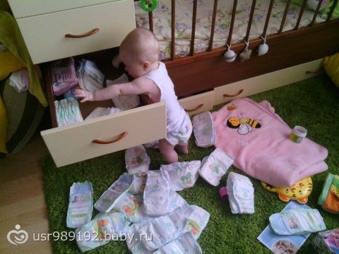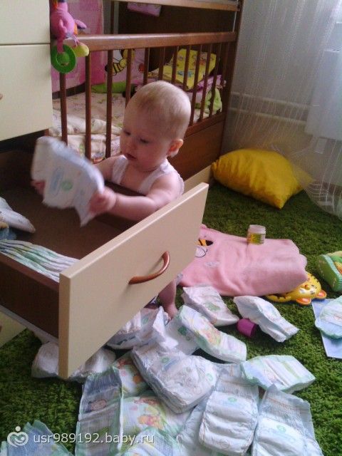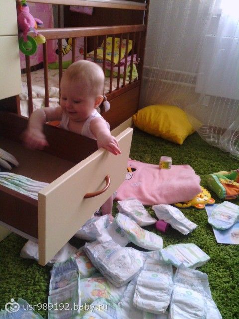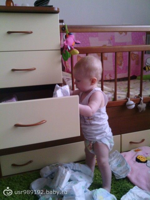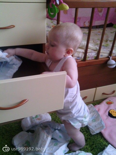 Самостоятельная такая стала, сама подползла, сама встала на четвереньки, сама держась за палки у кроватки встала на ноги, ОТКРЫЛА САМА нижний ящик, и понеслась, порядки наводить, мин 10 стояла разбирала и то я оторвала ее от процесса одеваться на улицу, такая большая уже!!!!!)))))