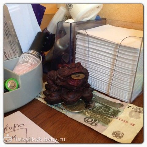 А ещё девчат)))))) не поверите) я ходила тут на педикюр, в новый открывшийся салон, у мастера дела не очень шли, ей посоветовали поставить жабу на деньги, дела у неё стали налаживаться неделю спустя