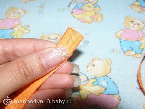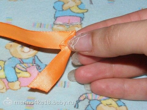 2. Середина розы. Держите ленты горизонтально. Заверните с правого угла по диагонали так, чтобы у вас остался конец ленты около 1,5 см.