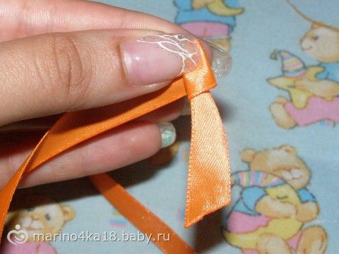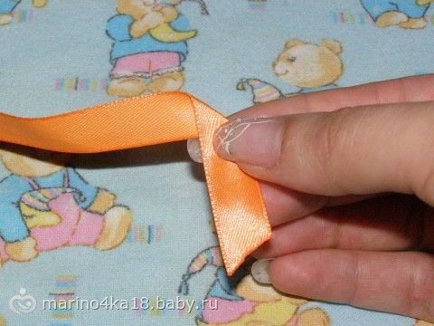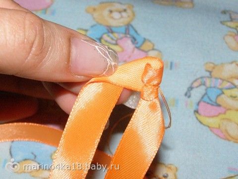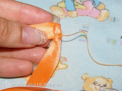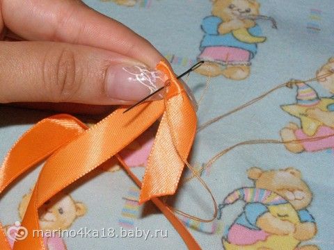 5. Держа крепко ленту, проведите иглу с нитью сквозь все слои ленты.