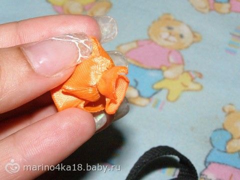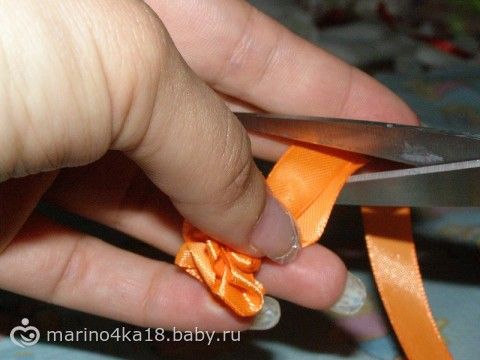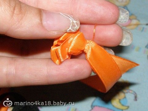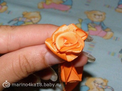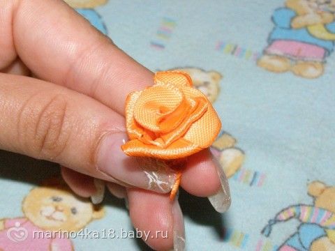 7. Лепестки розы. Держите середину розы в правой руке. Отогните верхний край ленты назад и вниз другой рукой.