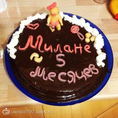 Девчонки привет!!! так уж завилось у нас, что мы справляем каждый месяц моей дочи)) каждый месяц у нас как «день рождения» с подарками, цветочками и тортиками))) я радуюсь всем мелочам и всем достижениям моей крохи и каждый месяц мы как бы подводим итоги)))собирается узким кругом и любуемся нашим маленьким человечком) 4 месяца я покупала я покупала торт!.. но вот в 5 решила попробовать сделать сама!!! ну и заморочилась я… но считаю, что магазинному торту не уступает мое творение!!!!!!!!!!!