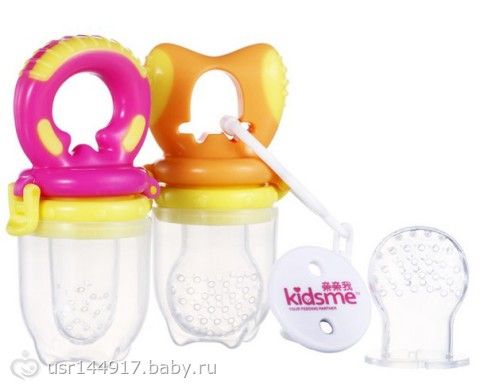 Такая штука, через которую ребенок сам фрукты и овощи есть может, обычно с сеточками в продаже, а я вот силиконовые нашла насадки, супер вещь)