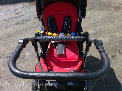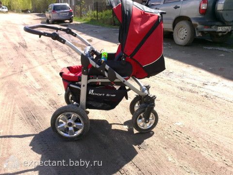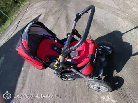 Шасси. Металл+пластик. Складывается шасси очень легко и быстро, раскладывается тоже. Задняя колесная база широкая, передние два колеса — поворотные, ось чуть меньше, можно заблокировать. Надувные. Амортизация высокая, просто супер. Кочки, сугробы, бордюры, колеи — точно будут не проблема. Тормоза — опускается и поднимается легко. Коляску фиксирует намертво, тросы сами по себе очень хорошие.