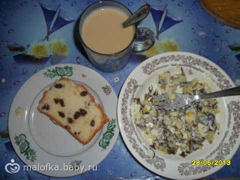Итак, завтрак: салат из морской капусты, кофе с молоком и кусочек кекса