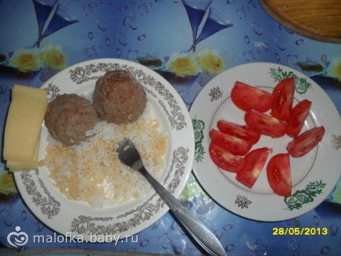 Обед: рис, чуть соевого соуса, котлетки, помидорка и пара кусочков сыра