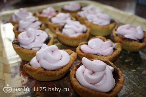 Затем берем сливки (жирн. 33%), взбиваем миксером, добавляем сахара или сах. пудры, немного ягодного пюре для цвета (я брала клюквенное) и загустителя для сливок (или крахмала). Затем берем полиэт. мешочек, отрезаем уголок и наполняем мешочек взбитыми сливками. Через отверстие в мешочке выдавливаем сливки на корзиночки. Можно использовать кондитерский шприц. И все, можно сразу употребить