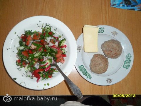 Обед: салат из помидорки, огурчика, редиски, перца, с зеленым луком, укропом и петрушкой, сбрызнутый лимонным соком, 2 котлетки, 2 кусочка сыра